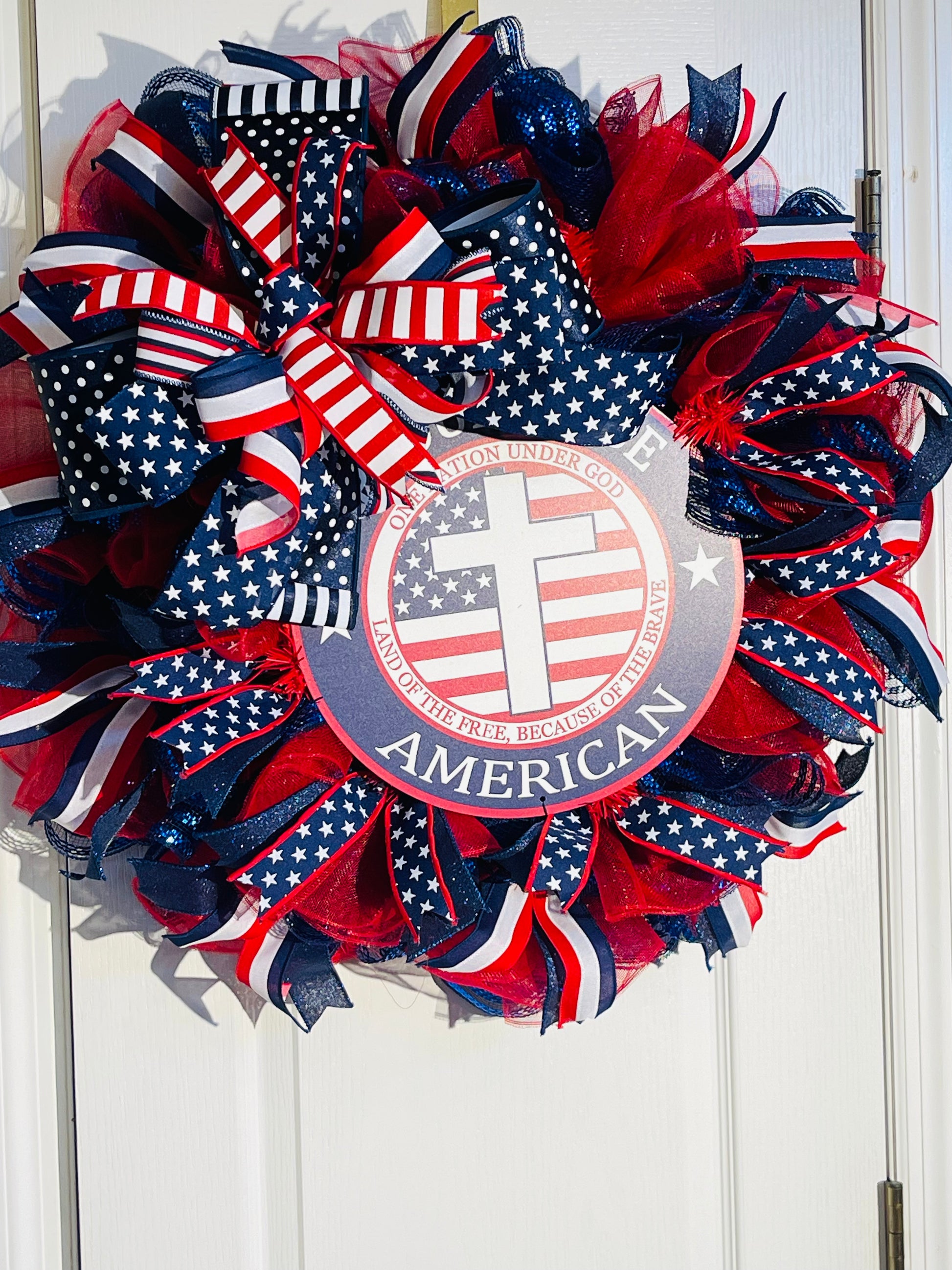 Show your pride with the Stars & Stripes Faith wreath. Featuring glittery mesh, flag-inspired ribbons, bold stars, and a central cross with a heartfelt message, this handmade piece celebrates both American spirit and Christian faith for any patriotic occasion.