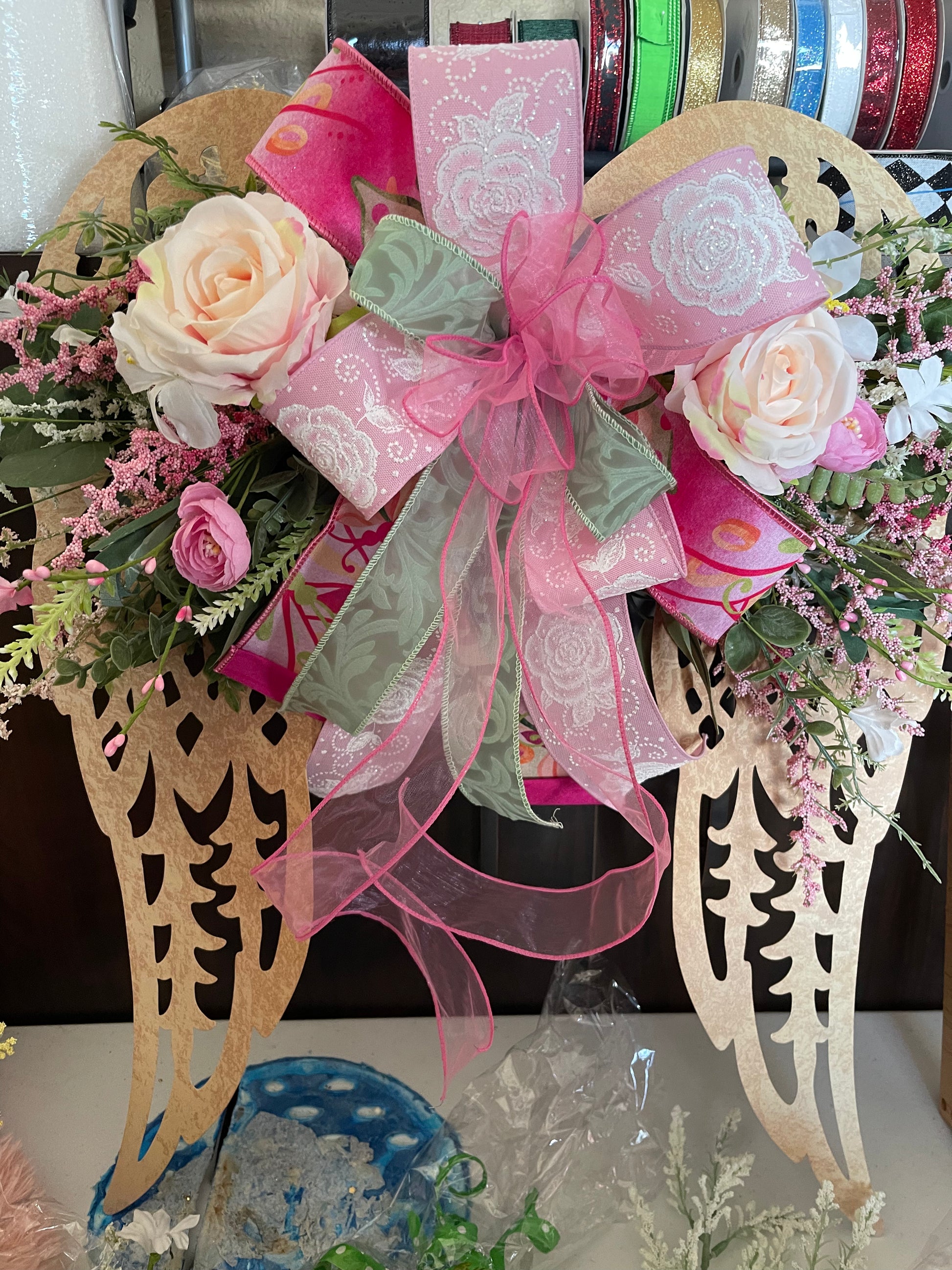 Add whimsical charm with the Garden Wings wreath. Featuring blush and ivory roses, cascading greenery, pastel florals, and flowing pink and sage ribbons on detailed wooden wings, this handmade piece brings elegance and a touch of garden magic to any space.